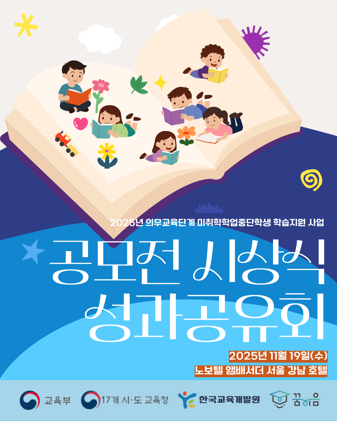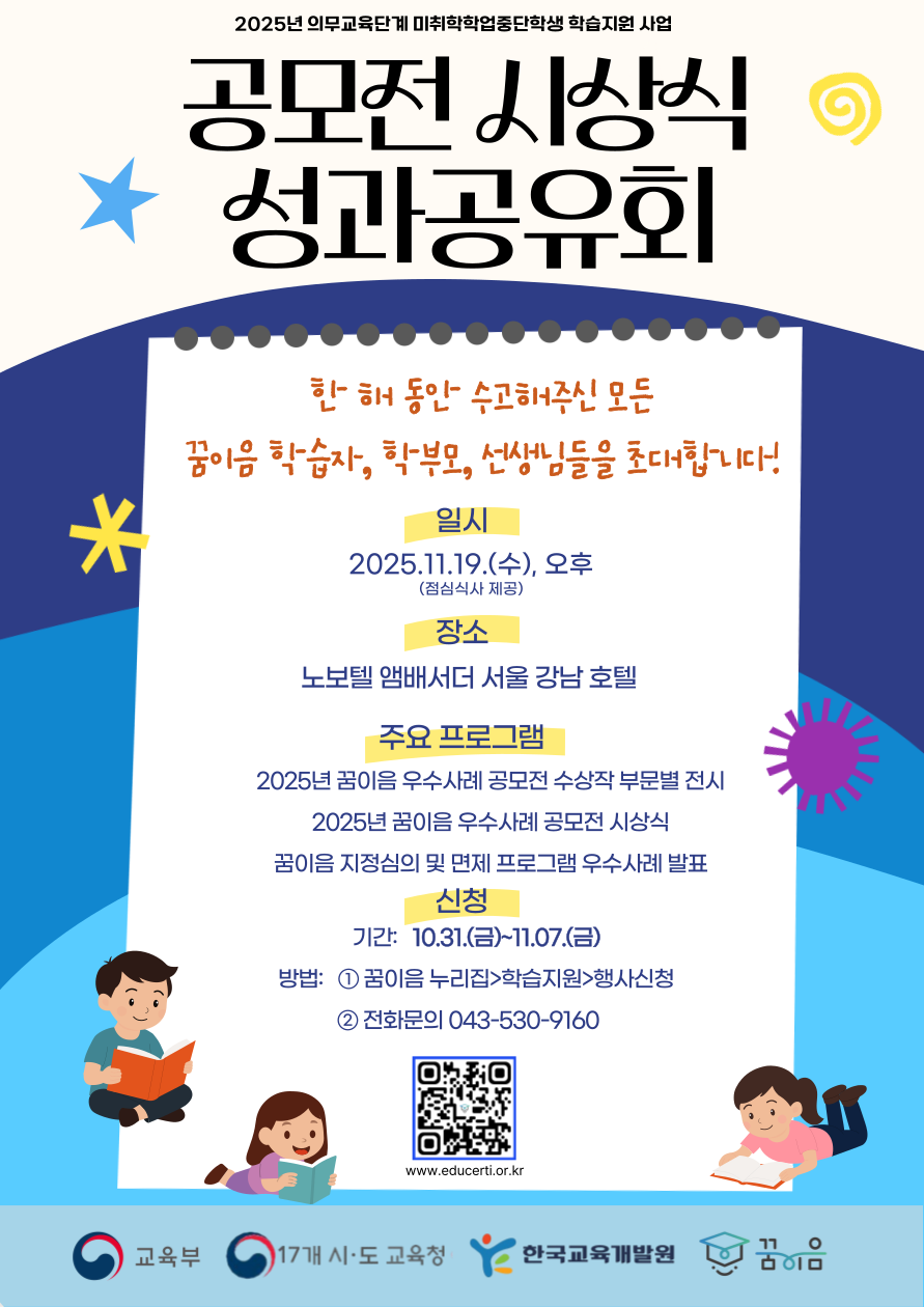 안녕하세요. 2025년 한 해 동안 꿈이음 사업을 위해 수고해주신 꿈이음 학습자, 학부모, 선생님들을 "2025 꿈이음 공모전 시상식 및 성과공유회"에 초대합니다. 2025년 꿈이음 공모전 우수작 시상, 지정심의 프로그램 우수사례 발표, 그리고 공모전 수상작 전시와 함께 맛있는 점심식사까지 유익한 시간이 준비되어 있습니다. 꿈이음 사업에 관심있는 누구나 참여가 가능하오니 많은 관심과 참여 부탁드립니다. 감사합니다. ■ 일시: 2025.11.19.(수), 오후 14시 ~ (* 점심식사 제공: 오후 12시30분 ~ ) ** 추후 참석자 대상으로 정확한 일정 안내 메일 발송 예정 ■ 장소: 노보텔 앰배서더 서울 강남 호텔 ■ 주요 프로그램: - 2025년 꿈이음 우수사례 공모전 수상작 부문별 전시 - 2025년 꿈이음 우수사례 공모전 시상식 - 꿈이음 지정심의 및 면제 프로그램 우수사례 발표 ■ 신청 신청기간: 10.31.(금)~11.07.(금) 신청방법: ①꿈이음 누리집> 학습지원 > 행사신청 ②전화문의 043-530-9160